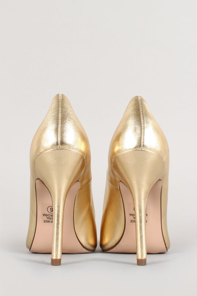 Description This shimmering pointy toe , scooped vamp, stiletto heel, lightly padded insole, and easy slide style.