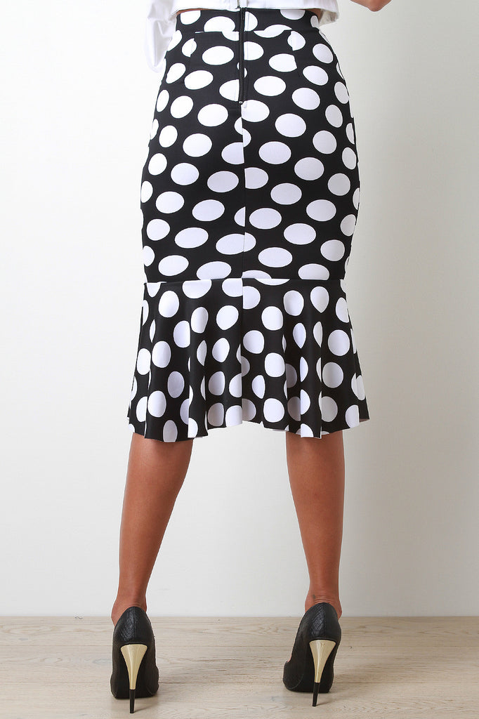 This midi skirt features big polka dot print fabric, flared mermaid-style bottom, and rear zipper closure. Accessories sold separately. Made in U.S.A. 96% Polyester, 4% Spandex.