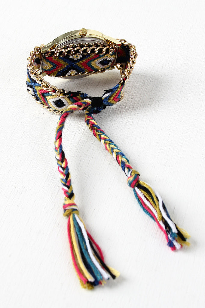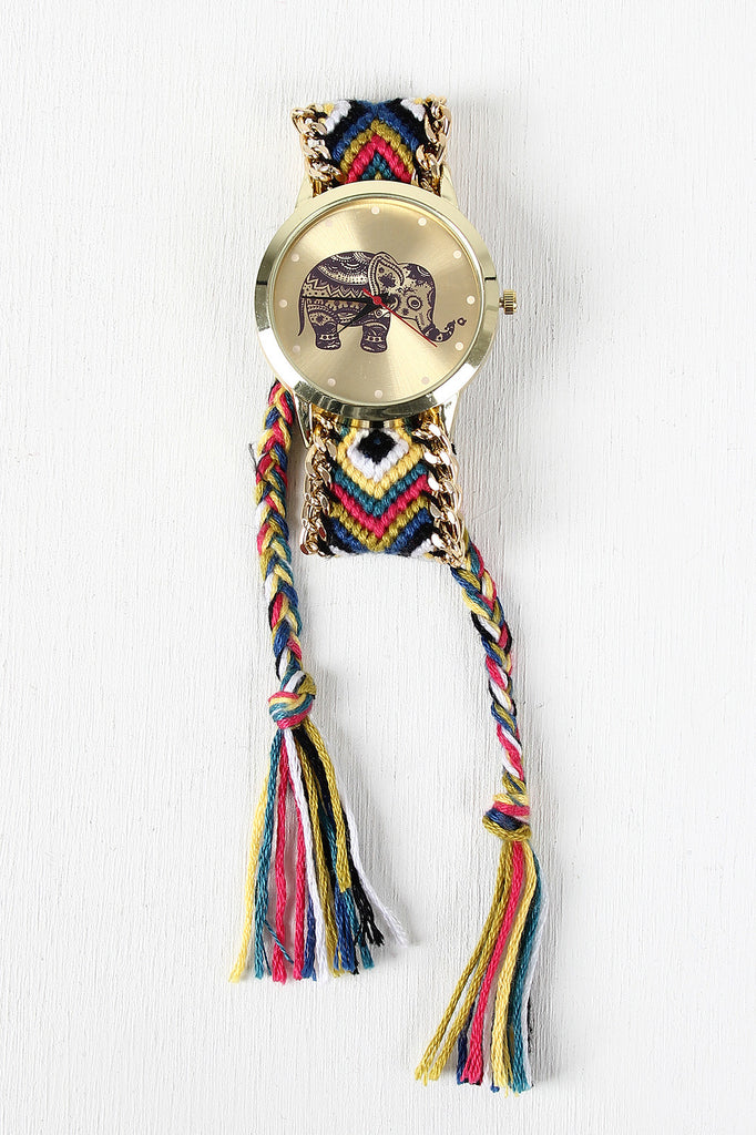 This watch features an Indian elephant face design, braided friendship straps with adjustable drawstring, and glossy curb link chain trim.