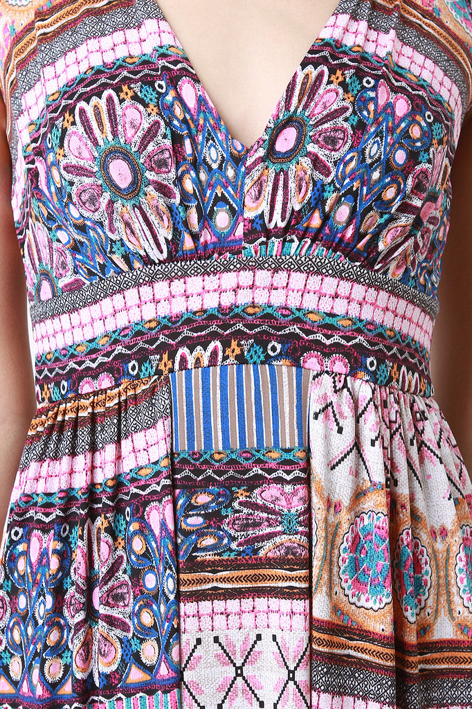 This maxi dress channels your inner tribal beauty. It was designed with a detailed tribal fabric with accents of various colors and geometric designs. Features a deep v-neckline, two high slits along the front. Finished with a racer back detail. Accessories sold separately. 96% Polyester. 4% Spandex.