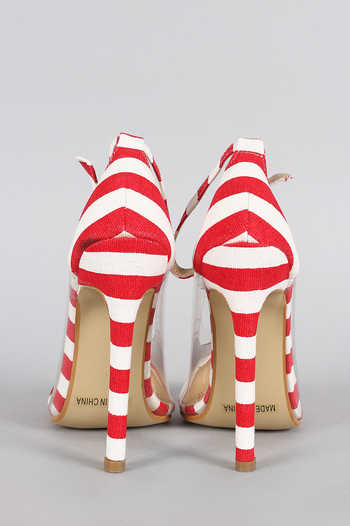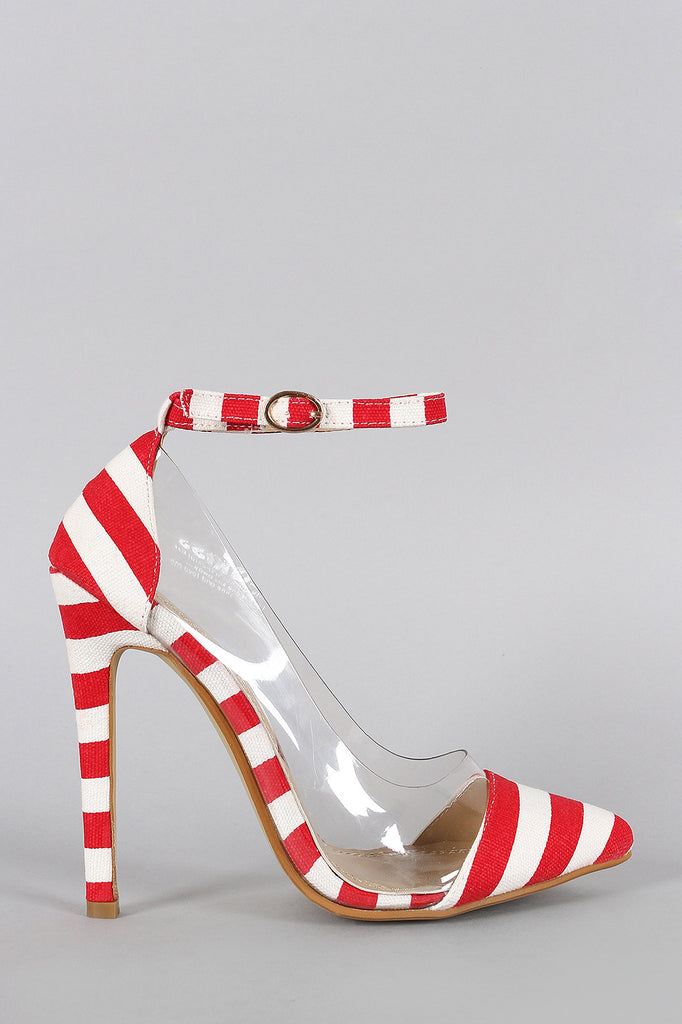 Description This alluring pump features a pointy toe, combination of striped print canvas/clear lucite throughout, and wrapped stiletto heel. Finished with lightly padded insole and adjustable ankle strap with buckle closure.