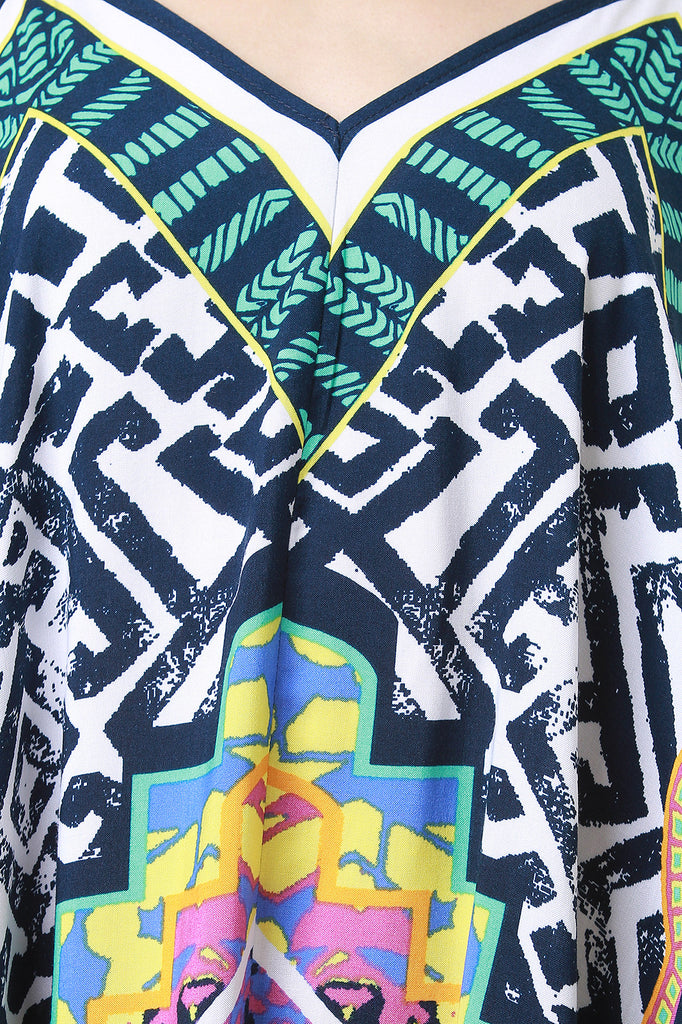 This trendy dress features bohemian inspired pattern print throughout, v-neckline, adjustable spaghetti shoulder straps, and an asymmetrical handkerchief hemline. Accessories sold separately. 100% Rayon.