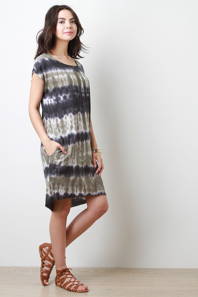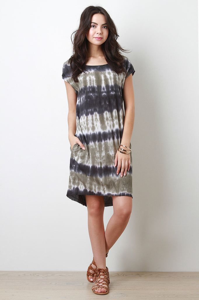 This lightweight casual dress features a two tone dye horizontal pattern throughout. Designed with small sleeves and a scoop neckline. Fished with hidden side pockets. Accessories sold separately. 100% Cotton.