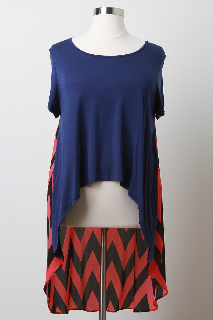 This breezy high-low top features a navy jersey front, two-tone chevron chiffon back, round neckline, and short sleeves. Accessories sold separately. Made in U.S.A. 95% Polyester, 5% Rayon.