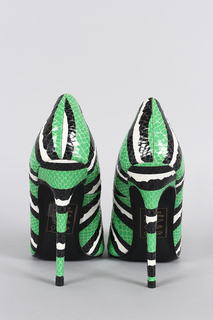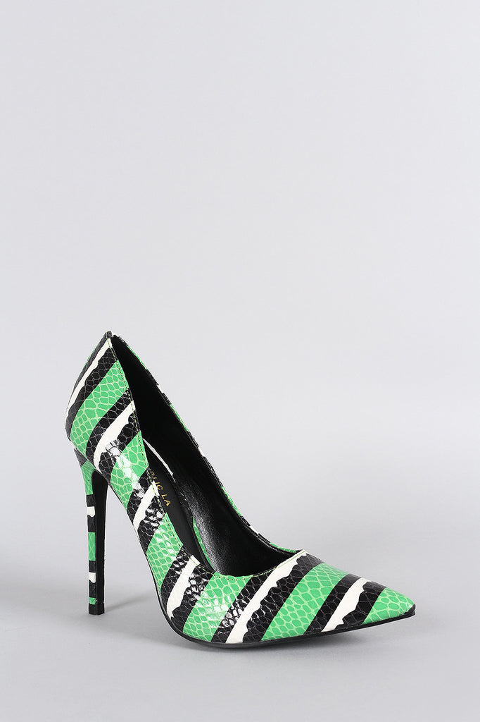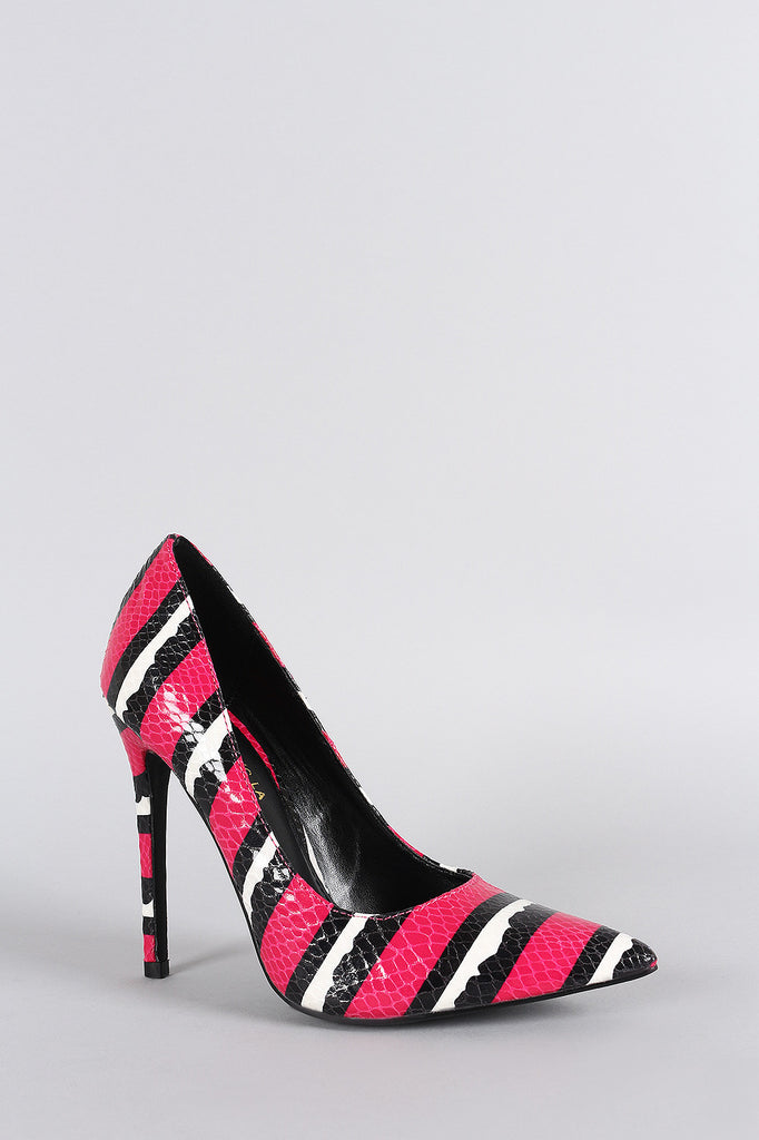 Description This pointy toe easy on-off wear silhouette. Features a snake embossed design throughout with a stripe pattern print. Finished with a leg-lengthening stiletto heel.