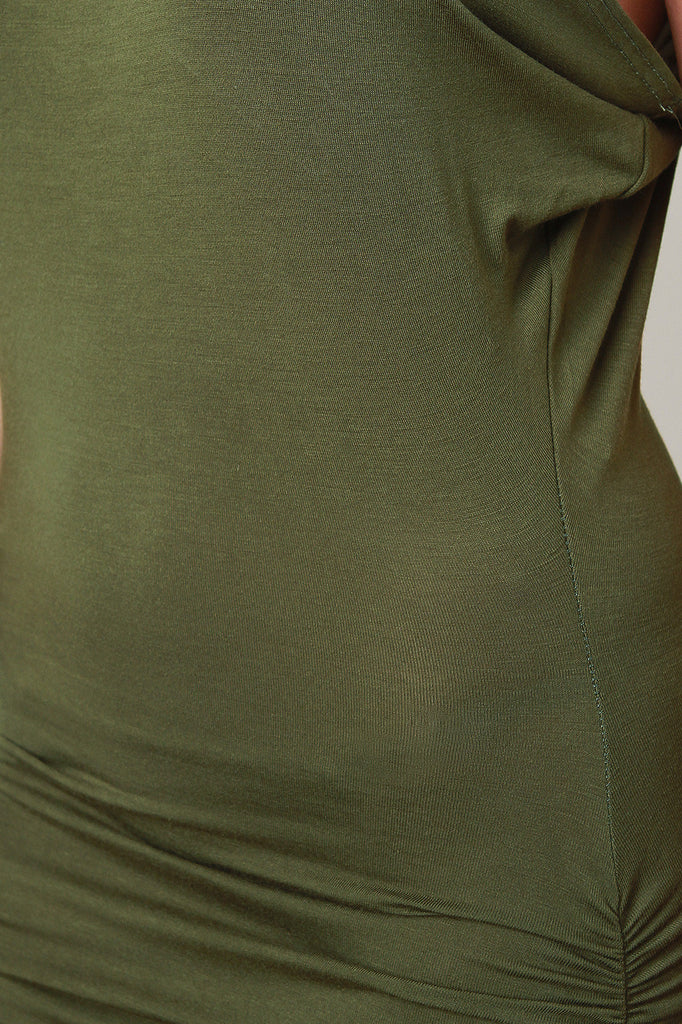 This jersey knit dress features round neckline, sleeveless construction, ruched design, and side slit. Accessories sold separately. Made in U.S.A. 95% Rayon, 5% Spandex.